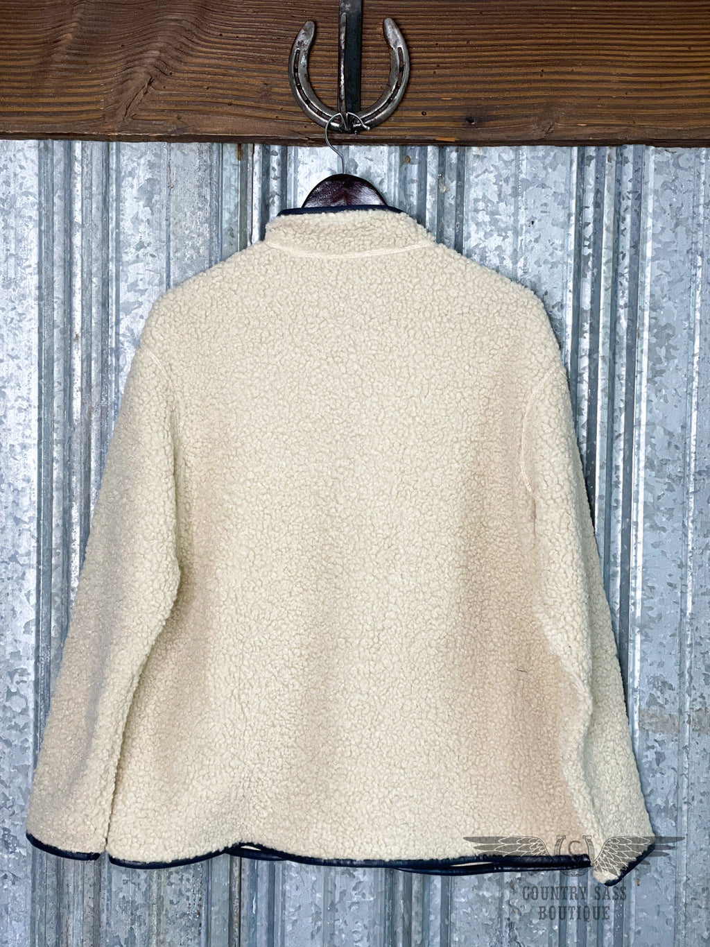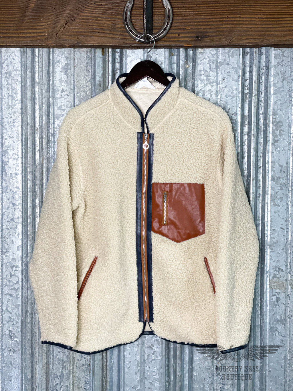 Stay warm and stylish in this faux fleece and leather jacket. This adorable jacket is made of cream faux fleece with faux leather accents with blue decorative piping.